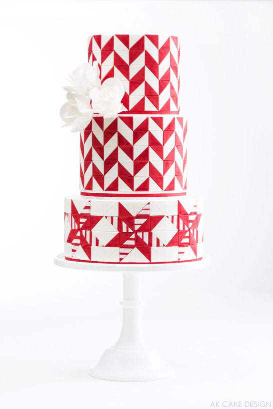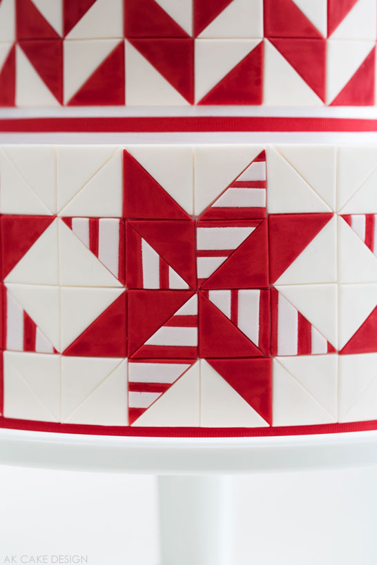 “For my top two tiers, I used a quilted herringbone motif reminiscent of those mysteriously disappearing candy canes. The red fondant triangles are hand-painted with red petal dust and lemon extract to give a velvety appearance.