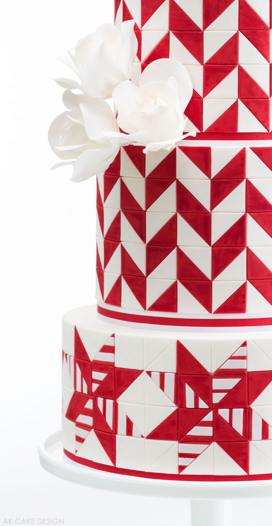 From a design perspective, I tied the two themes together using two elements – pattern and color. While the candy cane theme is created with a quilt pattern, the quilt theme is dressed in ‘candy cane’ red and white. For the finishing touch, a cluster of white sugar roses balances the design-heavy top of the cake with the whiter bottom tier.