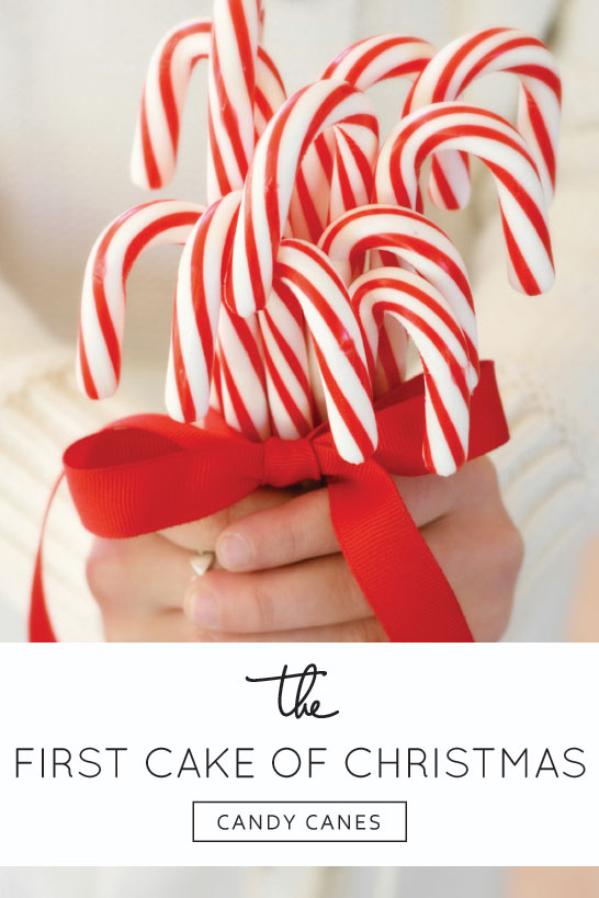 So let’s get started! Our first cake celebrates one of the most recognizable symbols of the holiday season. A twist of red and white peppermint that’s sticky sweet and smells like Christmas. The First Cake of Christmas was inspired by …. candy canes!