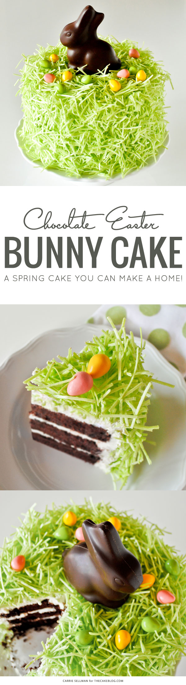 Chocolate Easter Bunny Cake – how to decorate this easy cake for Easter dessert, using edible grass, a chocolate Easter bunny and candy eggs.