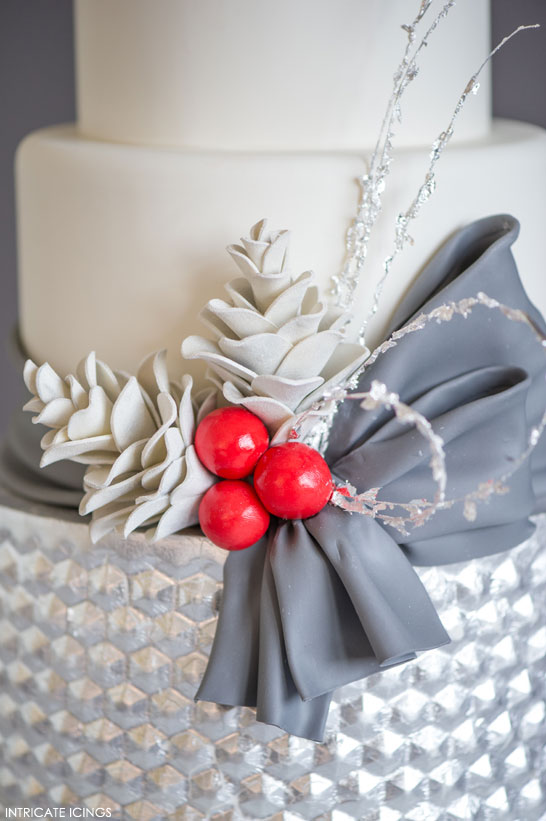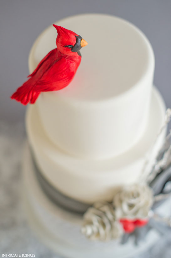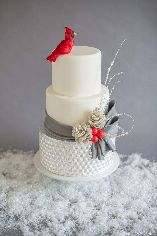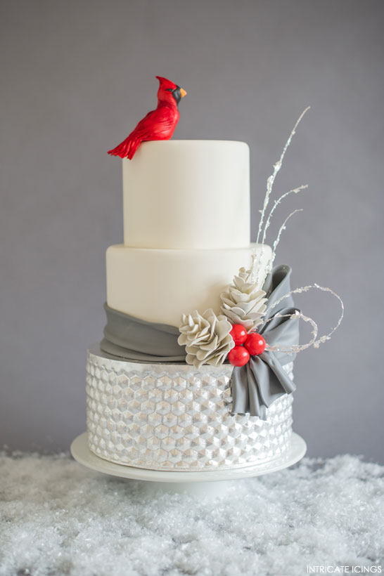 “When I think about my favorite Christmas traditions, decorating the mantle is high on my list… right after baking cookies and trimming the tree. My inspiration for this cake is a snowy pine cone wreath filled with red cardinals and glass ornaments, as well as a stunning mercury glass vase with white florals and silver tinsel. I combined elements of both inspiration pieces to create this simply stated cake that is full of details.”
