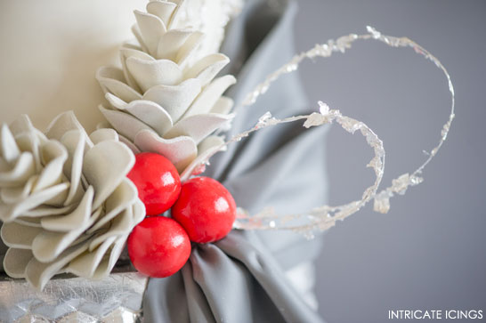 Absolutely spectacular! Thank you to Rachael of Intricate Icings for creating this incredible Christmas cake. And for sharing her tips and techniques with us… Not only is Rachael a talented designer but a gifted teacher and Craftsy Instructor. I’ve personally watched and learned from her incredible Craftsy class. So I know you’ll be excited to hear that she has created PDF tutorials for the pine cones and the silver leaf shown on this design. You can find them in her Facebook storefront.