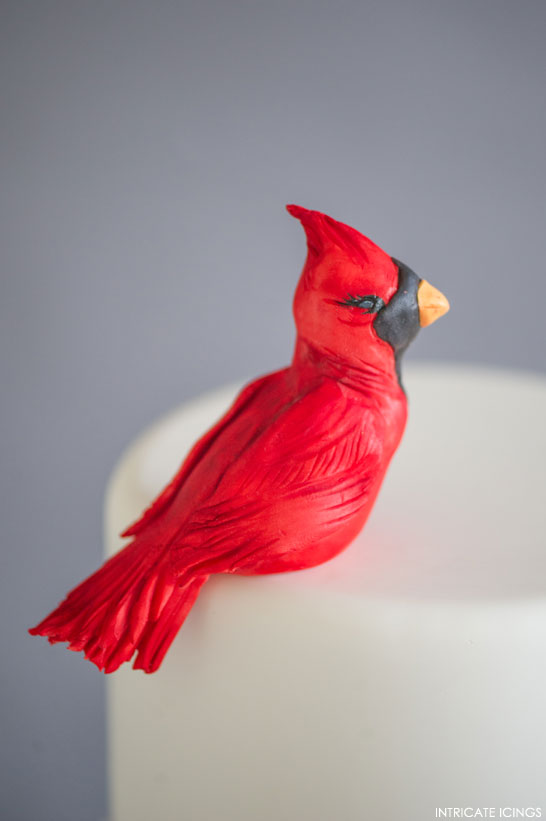 “The base of this cake was created by texturing a modeling chocolate panel that was then coated in silver leaf transfer sheets to give the shimmering effect of Mercury glass. I also used silver leaf on thin wires to create the look of tinsel. The pine cones were made from modeling chocolate and sprayed with luster to give the texture of snow. I hand sculpted the cardinal and added hand painted details to bring him to life.”