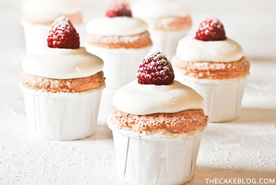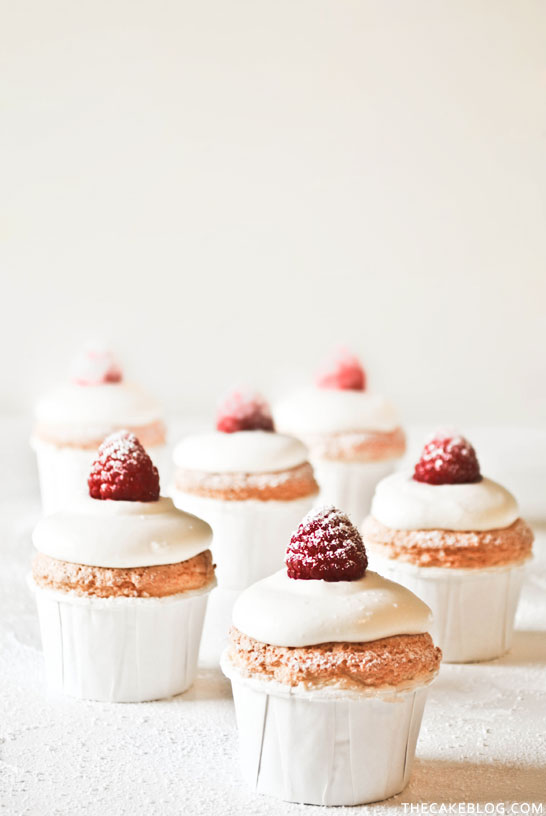 Snow Angel Cupcakes – light angel food cupcakes with lemon zest topped with whipped cream and fresh raspberries.