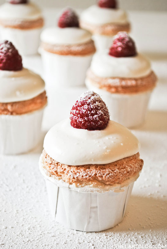 Snow Angel Cupcakes – light angel food cupcakes with lemon zest topped with whipped cream and fresh raspberries.